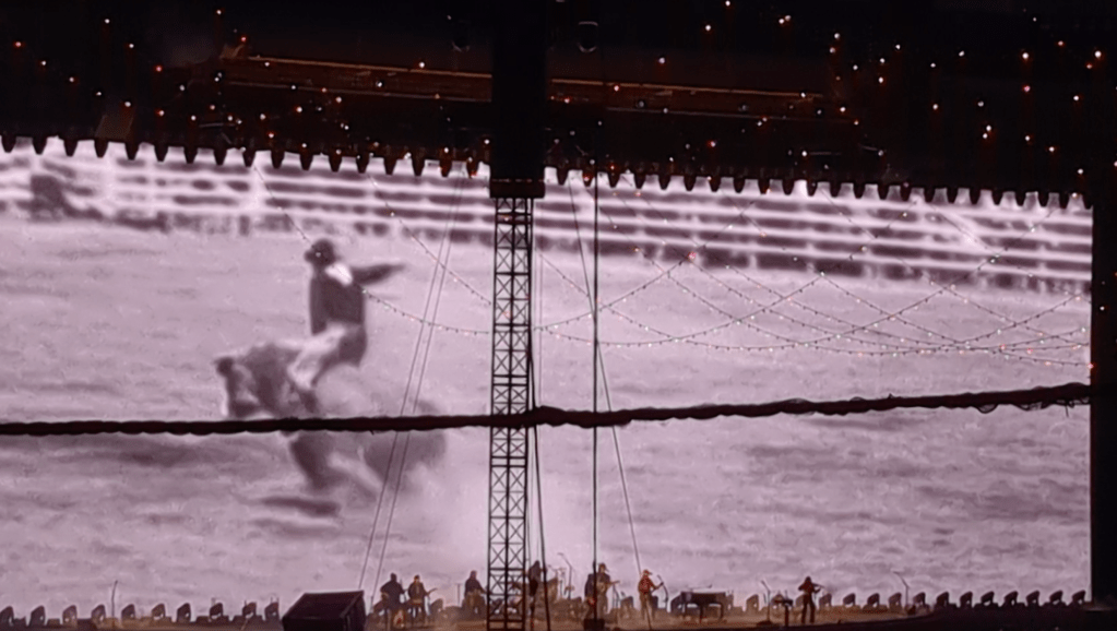 A grainy black western video lit across the entire stage backdrop as Zach and band kicked it off and the whole of the audience, which appeared to be sold out across all stadium levels, launched up from their seats, barely sitting down the entire show.