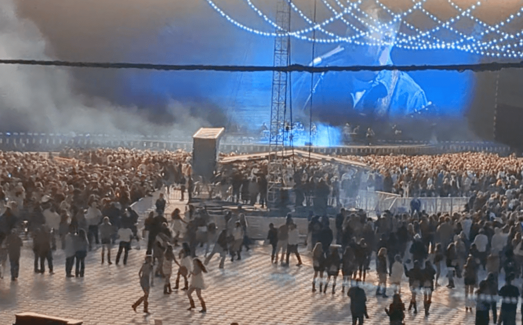 The encore was transplendent. A set of golf carts set out from the stage towards a different platform more in the center of the floor. As the floor crowd got the memo, there was a human surge in that direction. Then this platform lit up, and the band struck up a most lively rendition of Revival. There were many solos from the large and varied instrument pool on stage, including the kickass fiddle solo by the woman who apparently was a guest to the band subbing for a new father, and a fainting act – revival fashion, I realize, with embarrassment, in hindsight – by the banjo player that had me downright fooled. Fireworks ensued. Warm glows bathed the carefree dancers in their white sundresses on the small part of the floor that was empty. It was a stunner of a closing song and setting.