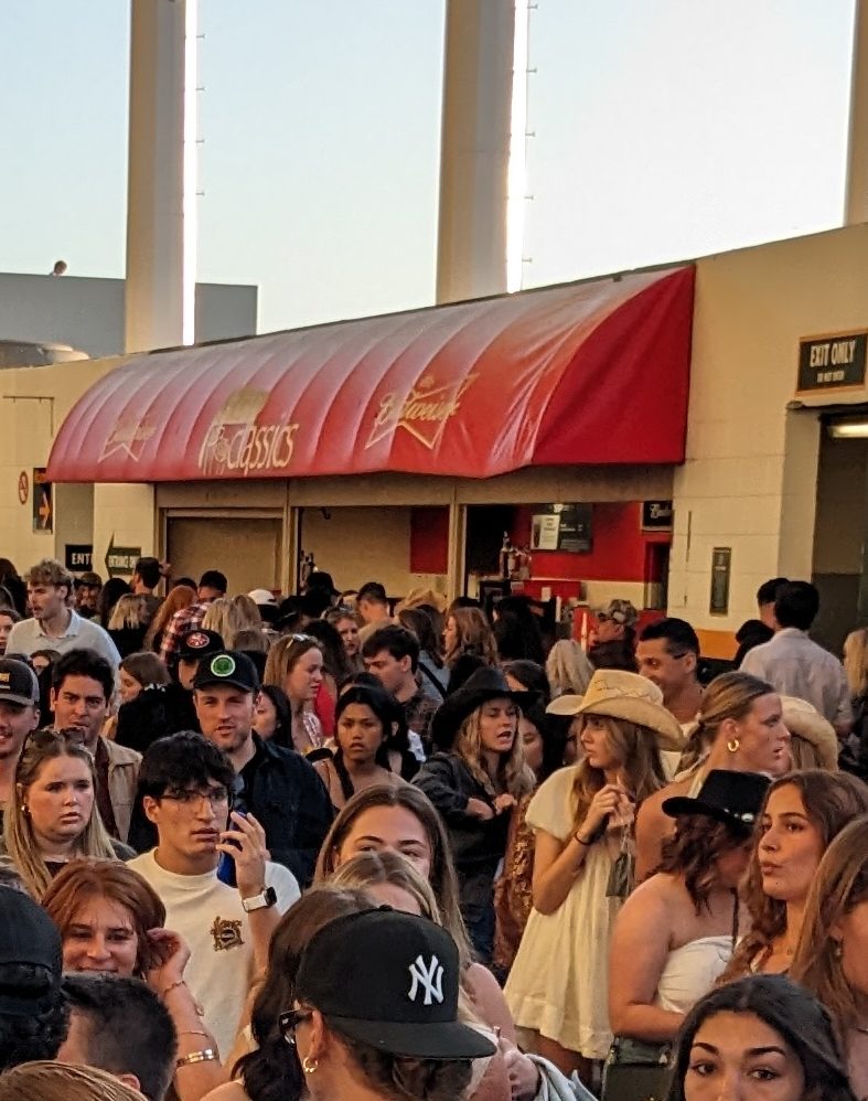 I spent most of Mt. Joy’s set braving those corridors and waiting in an enormous line for a tall can of Negra Modelo, failing at resisting feeling old and wrongly attired. I’m not sure where most of the crowd came from, but looking around, I felt a wistfulness at not being a woman who could pull off a wispy white sundress with a straw cowboy hat and cowboy boots, and not just because of the Bay Area’s Karl the Fog.
