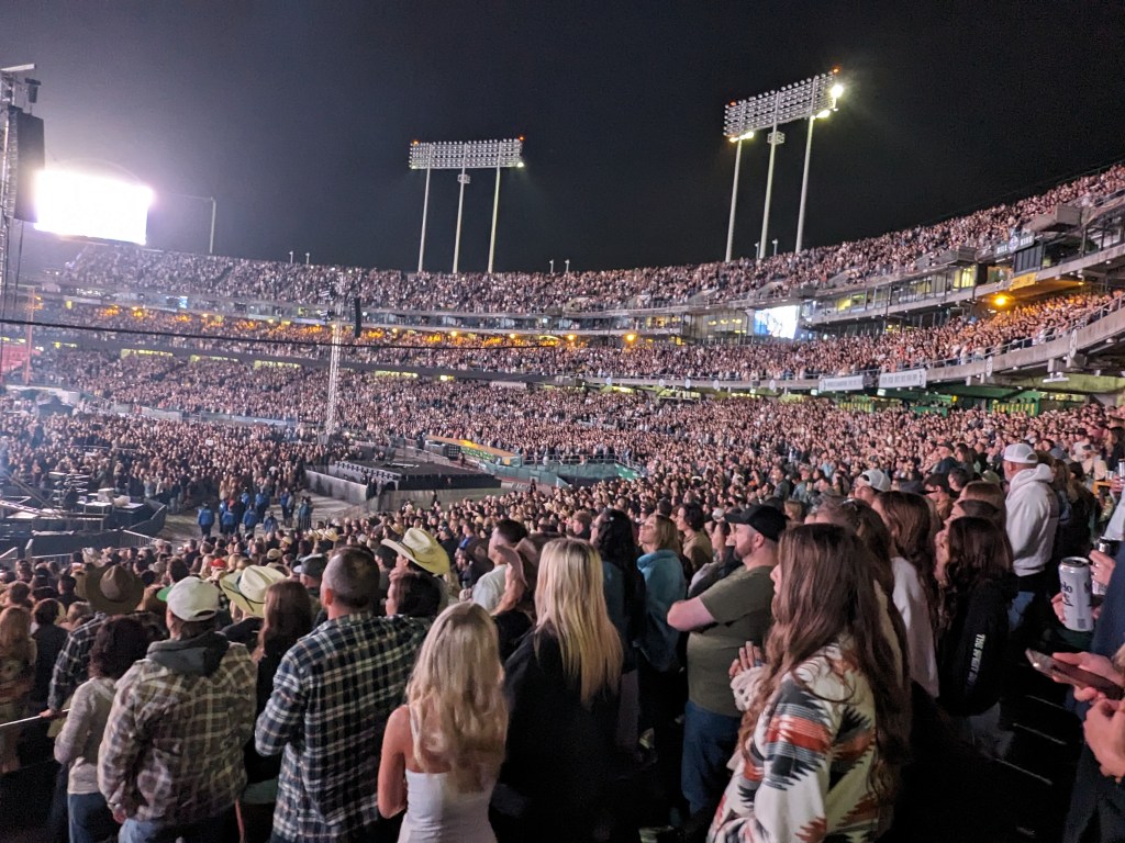 As the sun dipped below the stadium rim, the lovely strands of light strung back and forth across the field illuminated the view between seats and stage. By the time Zach Bryan came on, it was dark.