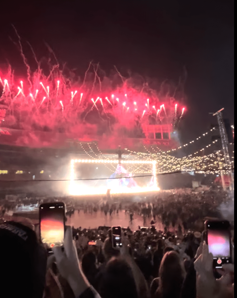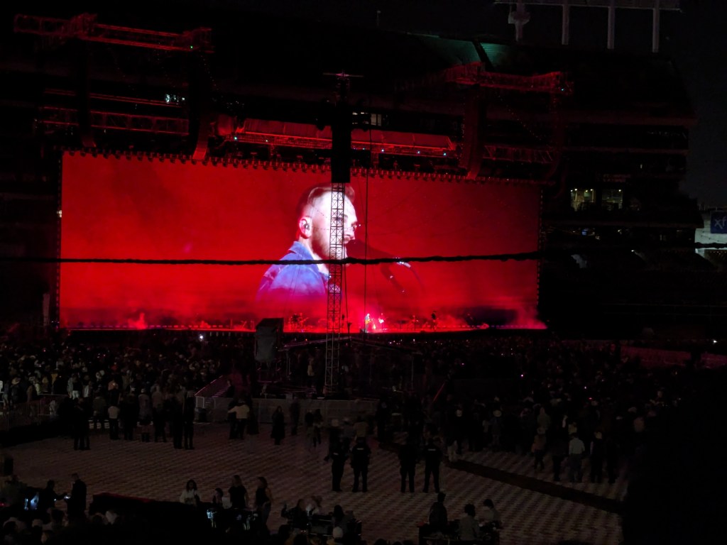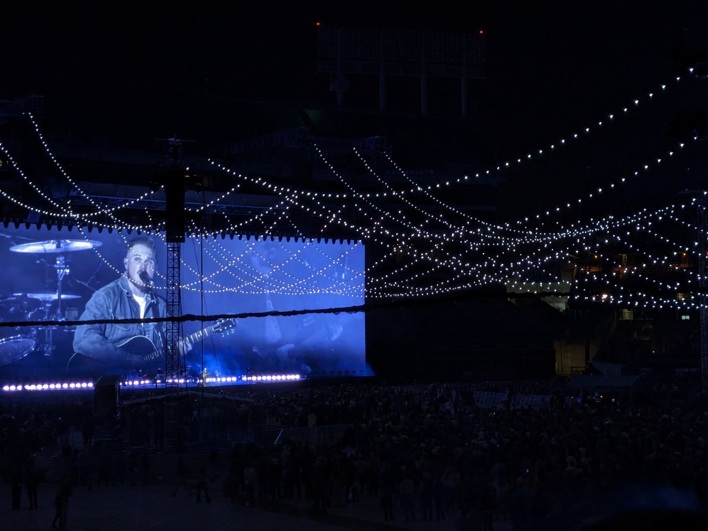 Our seats were up a couple levels and just left from center of the gigantic stage stretched out across the outfield. The field was half lined with chairs and half open space. It was already pretty full throughout the stadium and certainly mobbed just behind us inside.