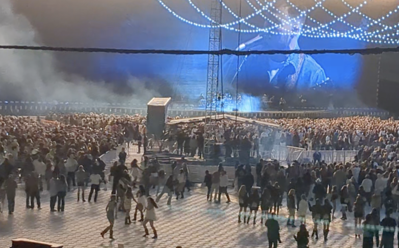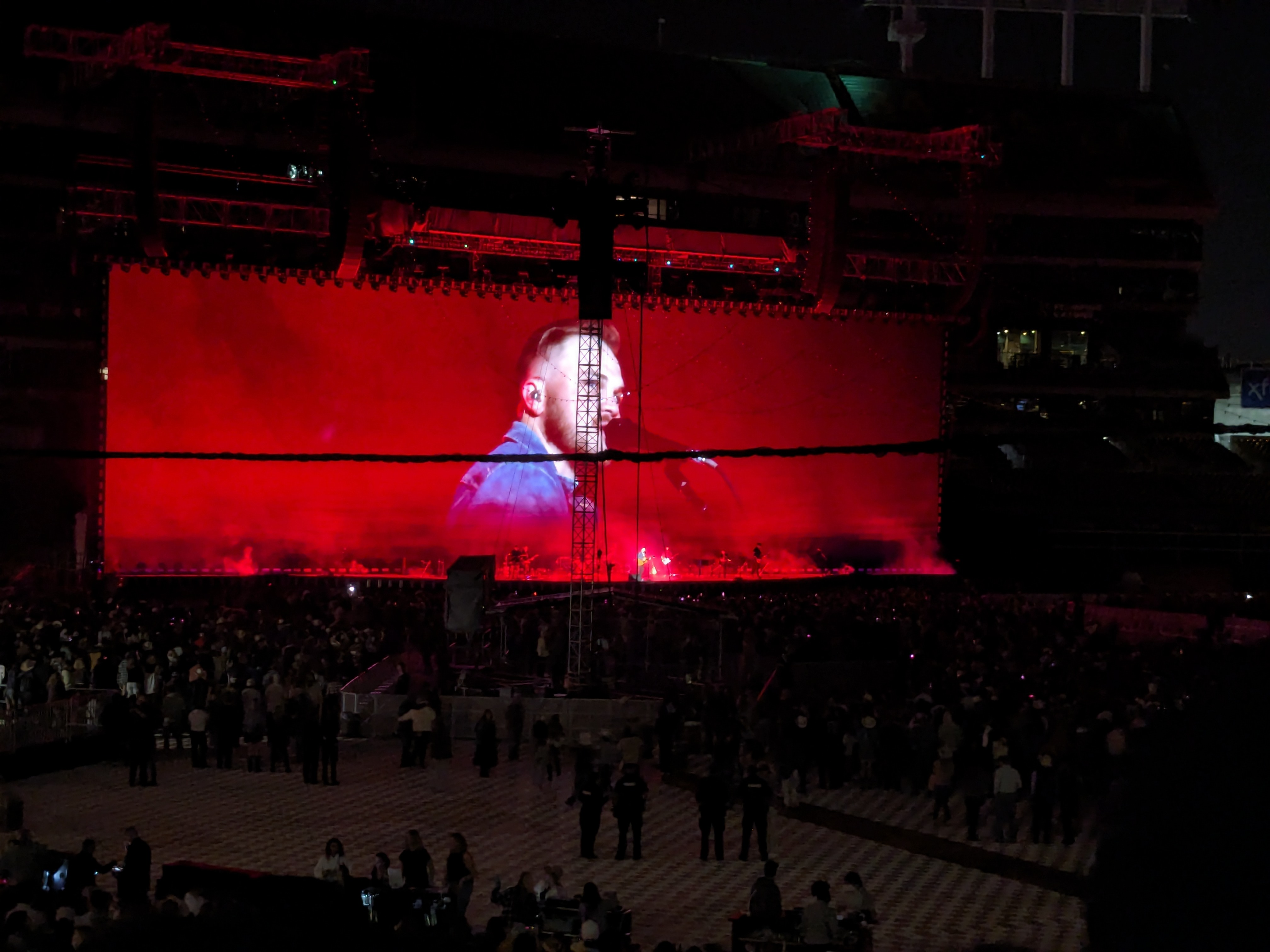 Our seats were up a couple levels and just left from center of the gigantic stage stretched out across the outfield. The field was half lined with chairs and half open space. It was already pretty full throughout the stadium and certainly mobbed just behind us inside.