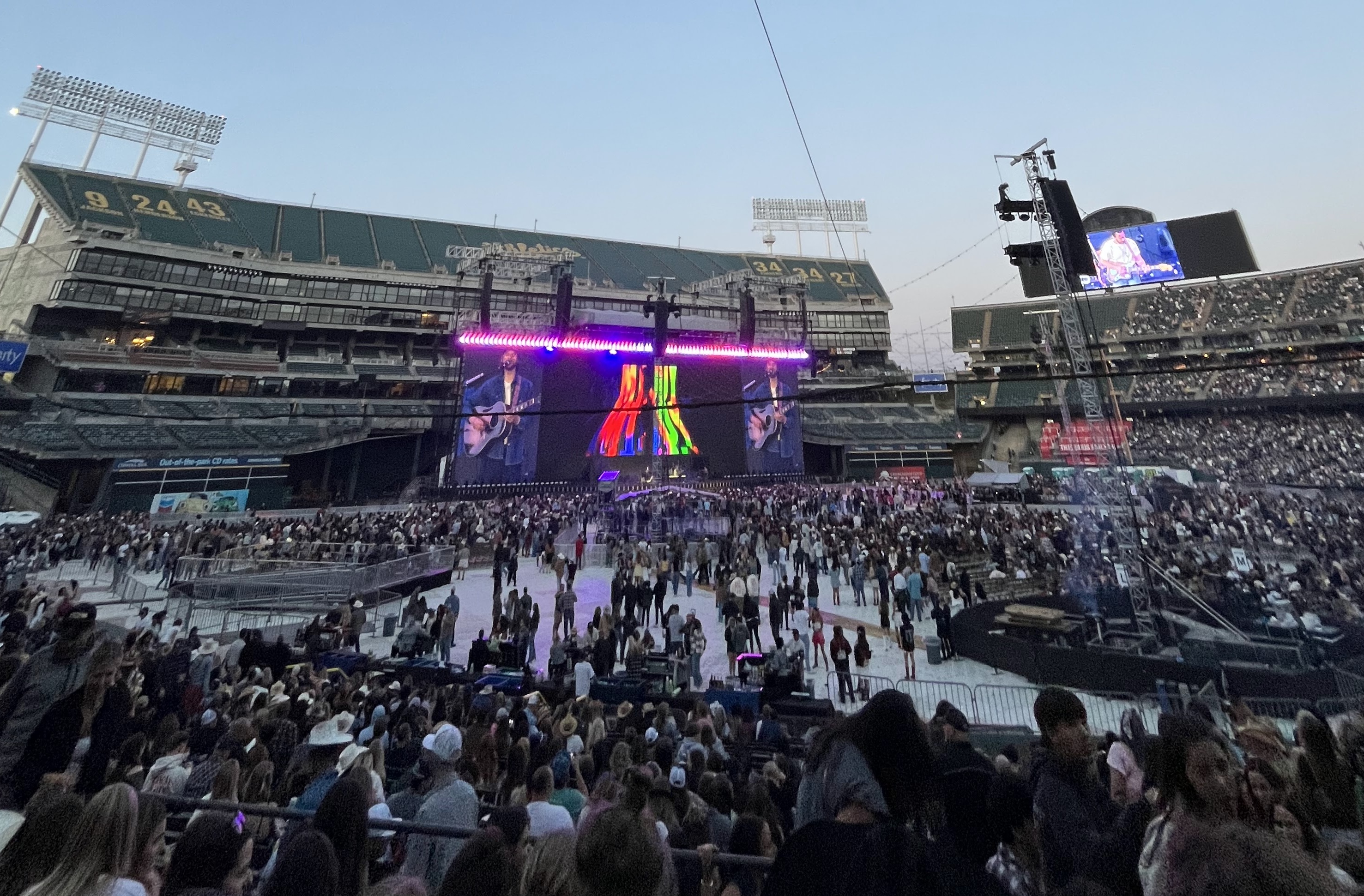Aside from the very pretty video backdrops, the first thing that struck me was Zach’s James-Dean-twinkly side-eye gazing in apparent wonder across the fired up crowd. He said something like he “never expected to play a crowd like this,” and although I wasn’t sure whether he meant Oakland, not necessarily a country stronghold, or the sheer stadium size, he seemed fully geniune admiring and thanking the adoring crowd the whole night. It sure looked beautiful from our seats, too.