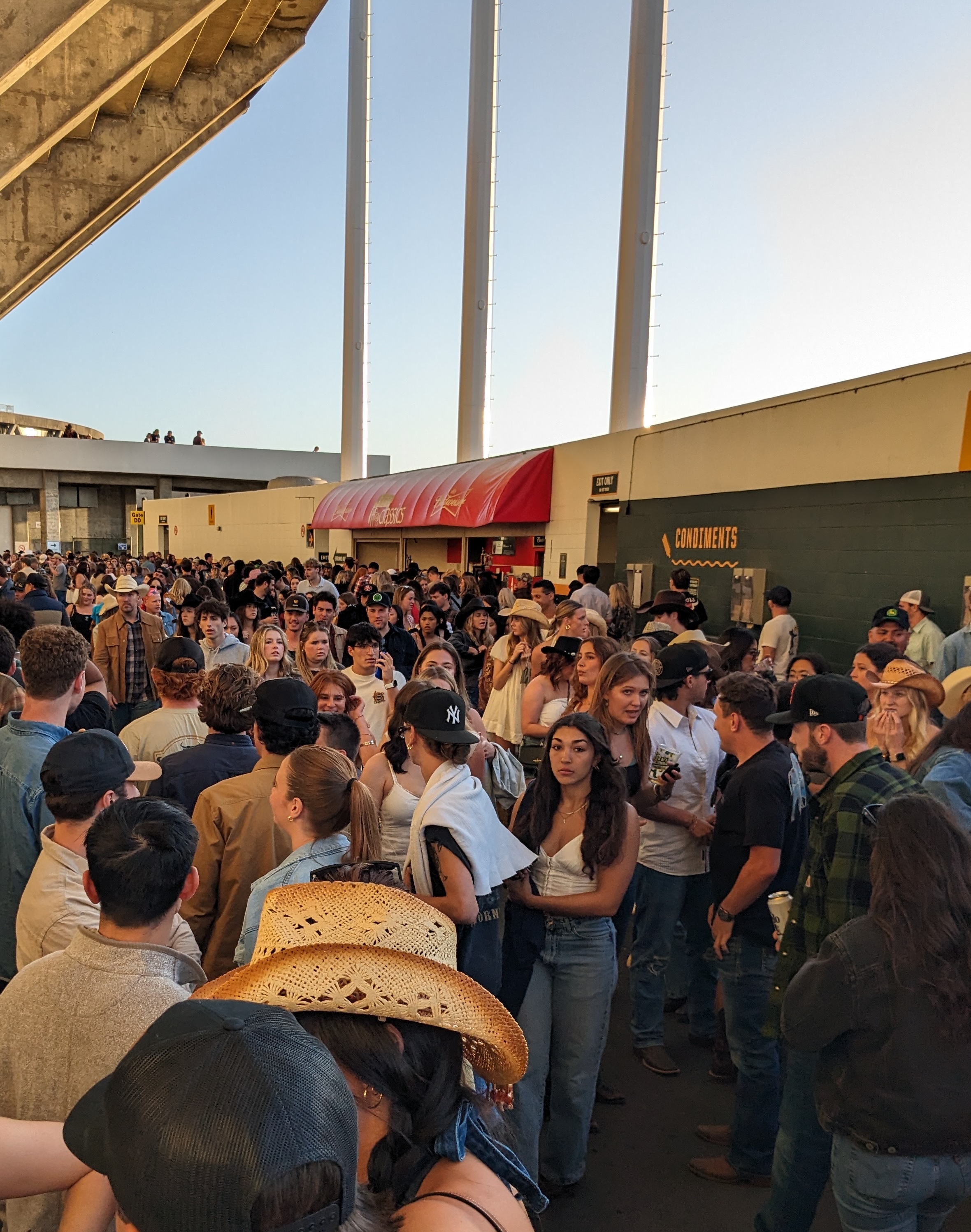 I spent most of Mt. Joy’s set braving those corridors and waiting in an enormous line for a tall can of Negra Modelo, failing at resisting feeling old and wrongly attired. I’m not sure where most of the crowd came from, but looking around, I felt a wistfulness at not being a woman who could pull off a wispy white sundress with a straw cowboy hat and cowboy boots, and not just because of the Bay Area’s Karl the Fog.